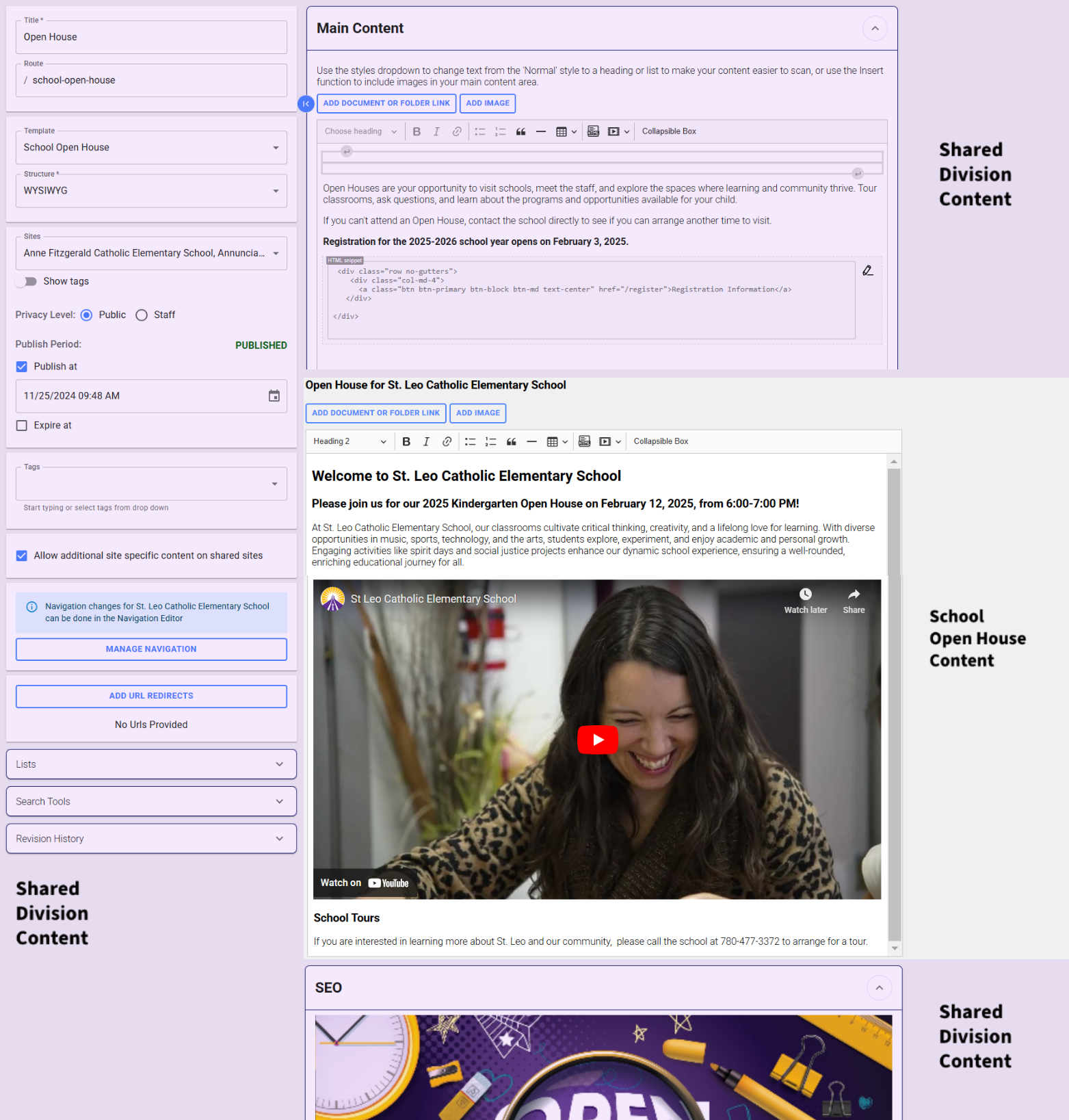 Note: You will not be able to edit Division content, only your Schools content section